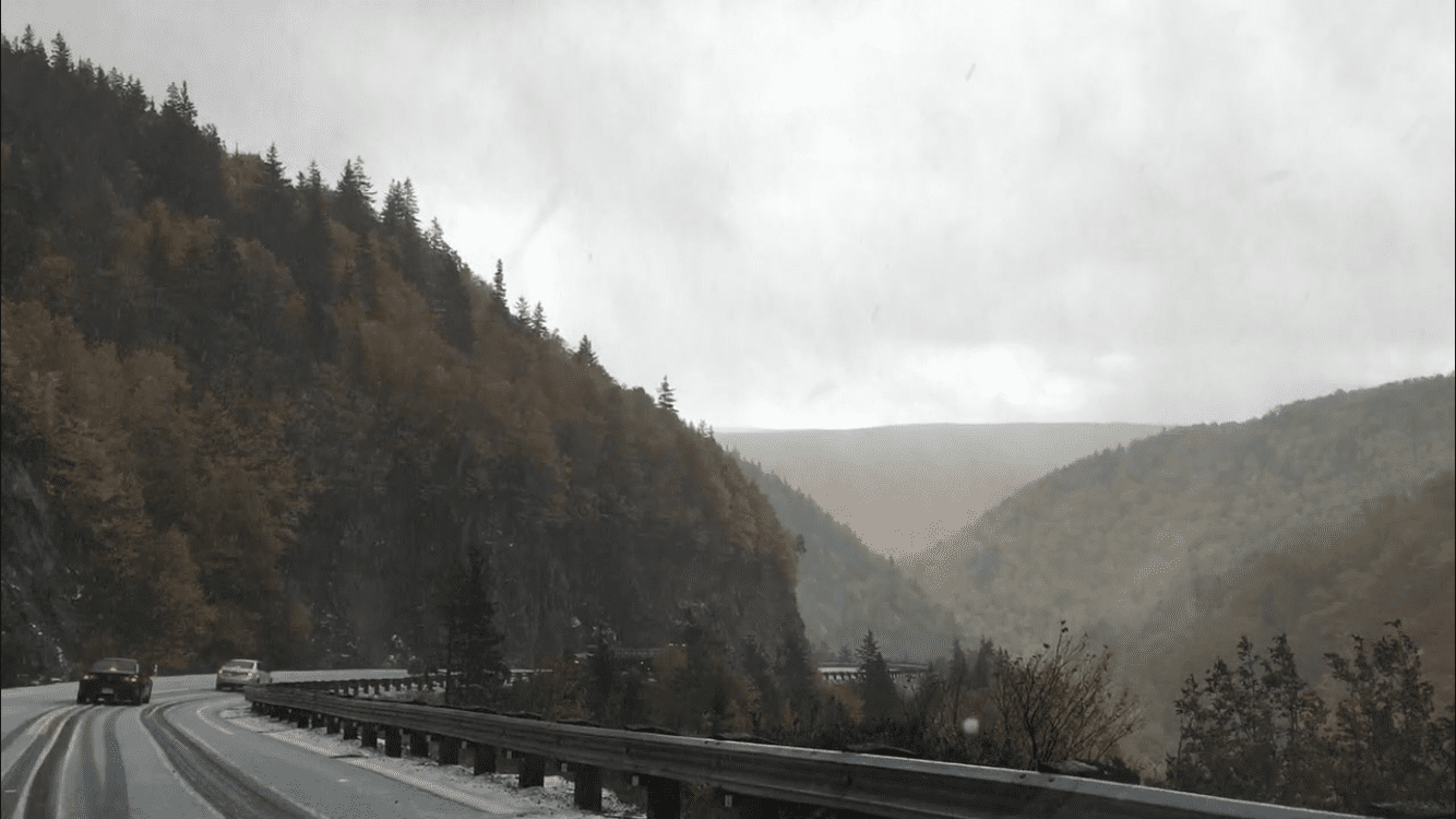 - Second snow of the day, on North Mountain. I was not driving while taking this photo!! Brake on, and emergency flashers on.
