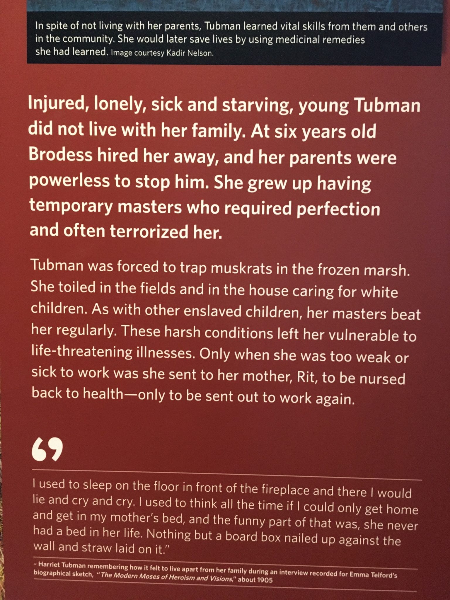 - One of the things that blew my mind was hearing about this work Tubman was forced to do as a child, trapping muskrats in the marsh. What excruciating risk to any body, to be immersed in the wet and cold for hours – especially for a young person. I imagine she learned some of the skills that became so valuable later in helping smuggle people along the Underground Railroad.