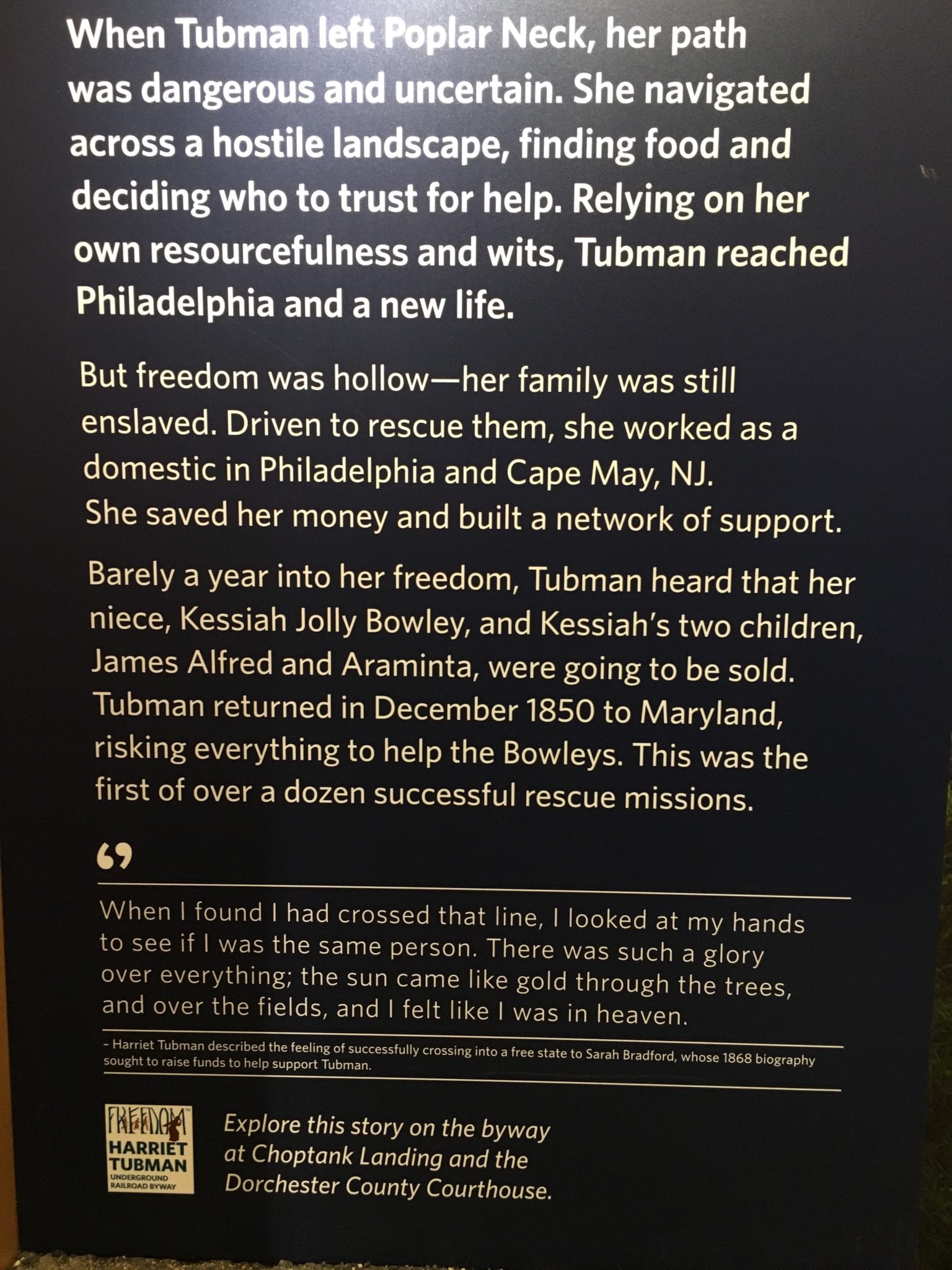 - “When I found I had crossed the line, I looked at my hands to see if I was the same person. There was such a glory over everything; the sun came like gold through the trees, and over the fields, and I felt like I was in heaven.” And then she went back, again and again, to save others.