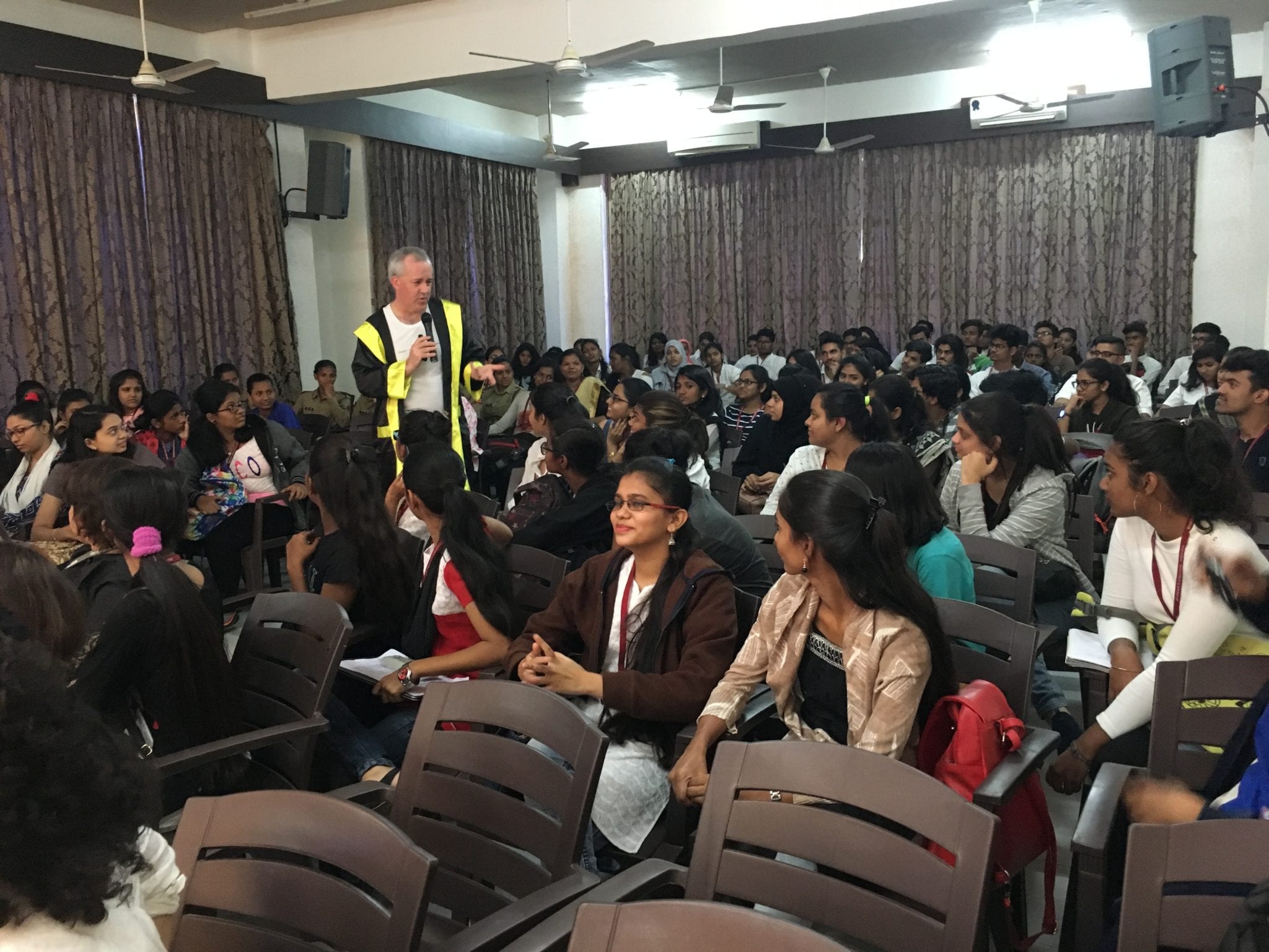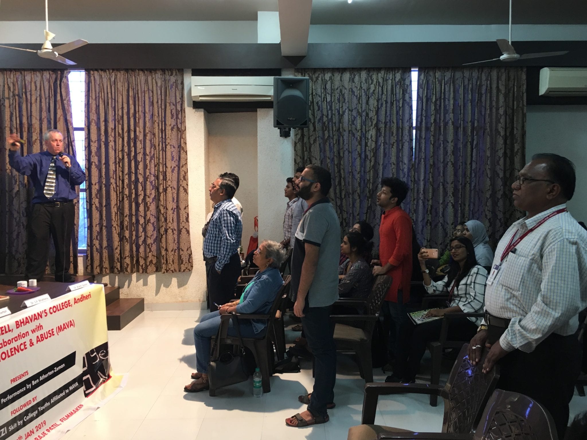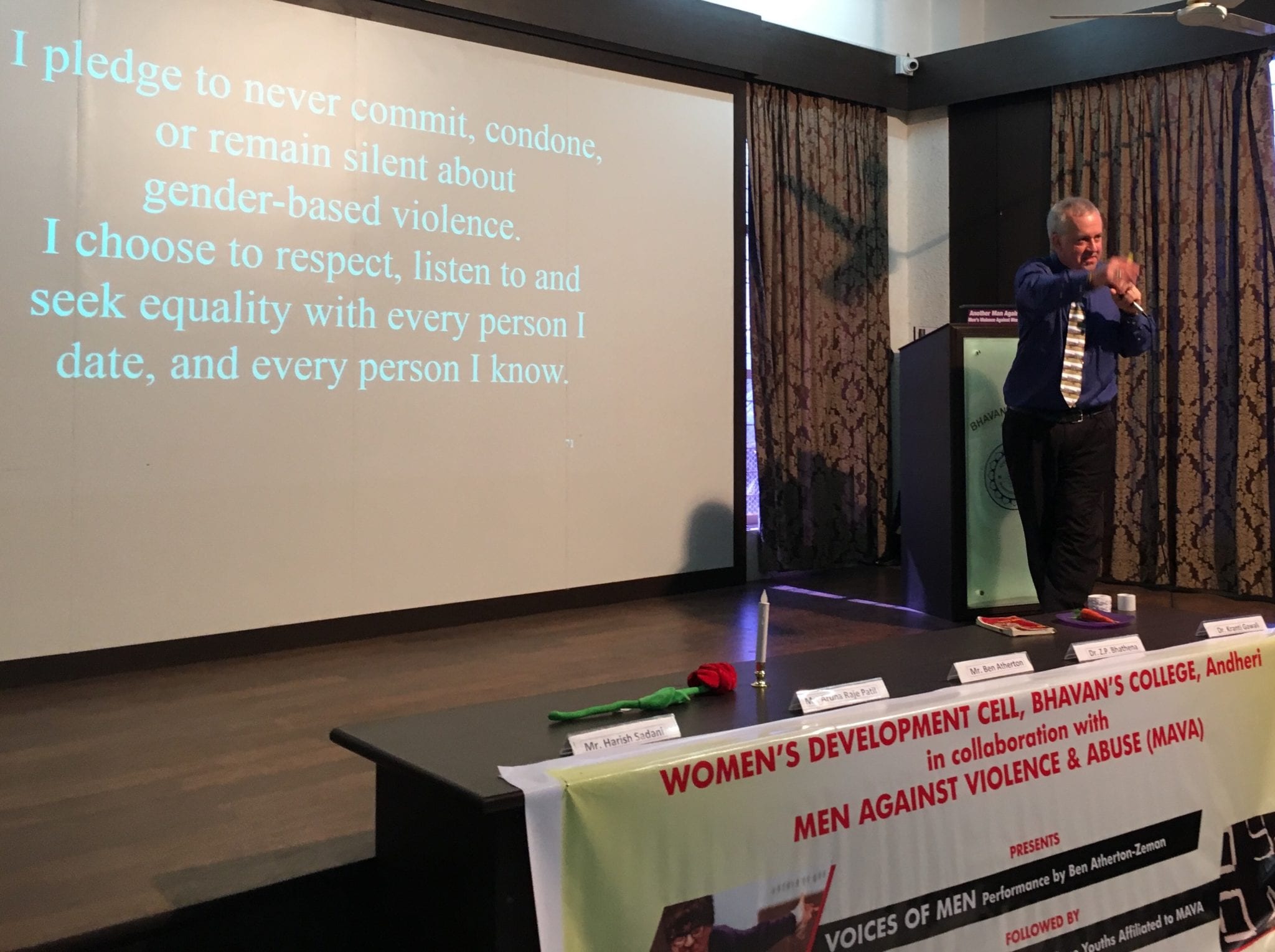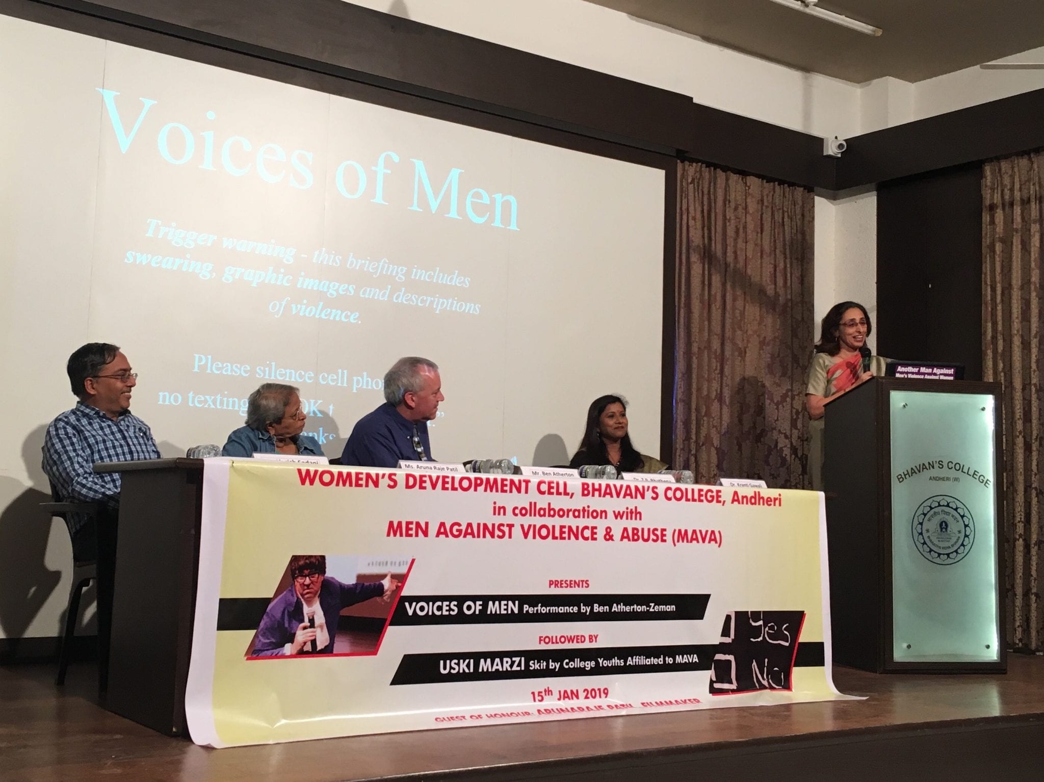 - Dr. Z.P. Bhathena, Principal of Bhavan’s College Liberal Arts school, opens the event. Also on the opening panel are: Harish Sadani of MAVA, feminist filmmaker Aruna Raje Patil, Ben Atherton-Zeman of Voices of Men, Dr. Kranti Gawali, professor of Psychology and our extraordinary host and sponsor of this event.
