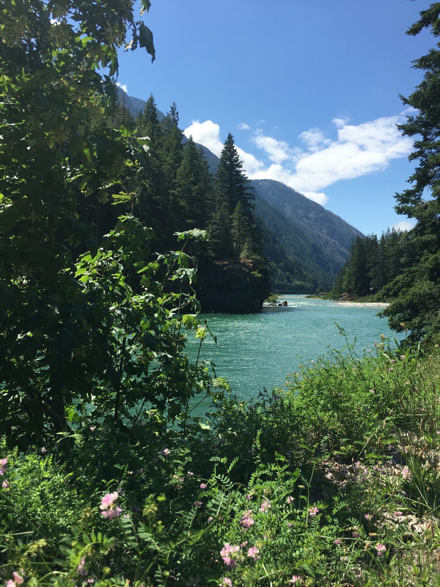 As one of the signs at Diablo Lake explains: “As glaciers in the surrounding high country slowly wear down the mountains, the grinding of rock against rock produces a fine silt that meltwater streams carry into the lake below. This “rock flour” suspended in the water reacts with light to give the lake its blue-green color.” I have seen this effect of rock flour in water elsewhere, but North Cascades National Park takes the cake in its intensity. Gorgeous!!