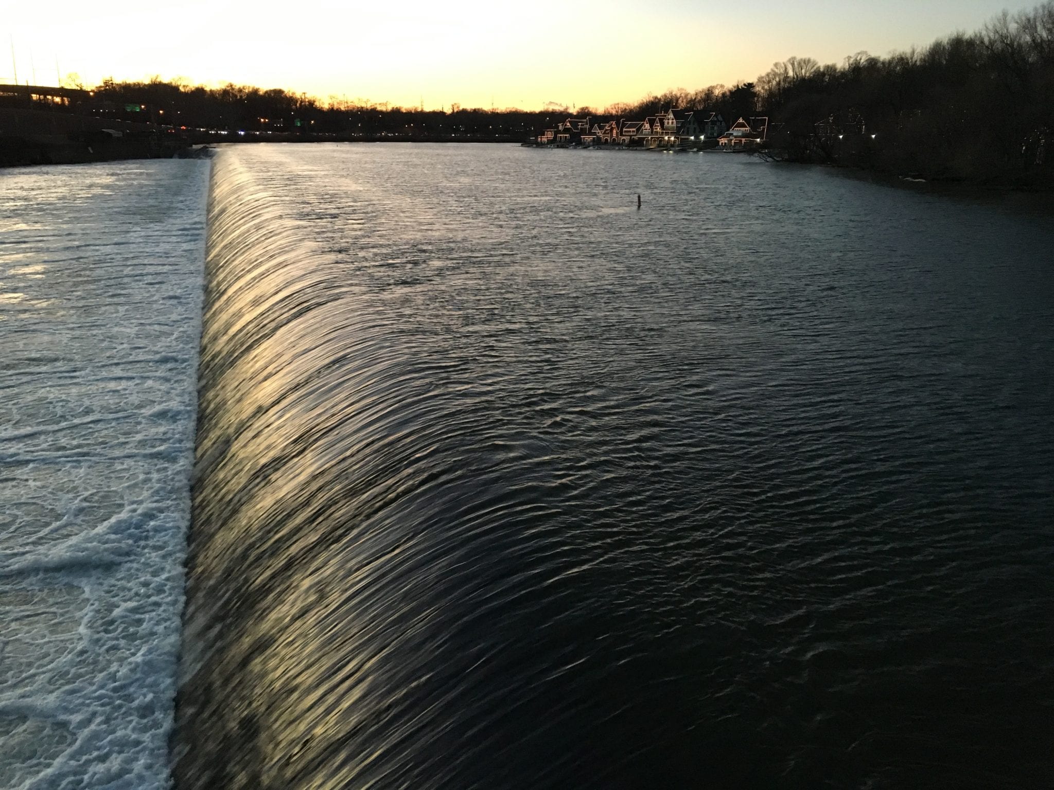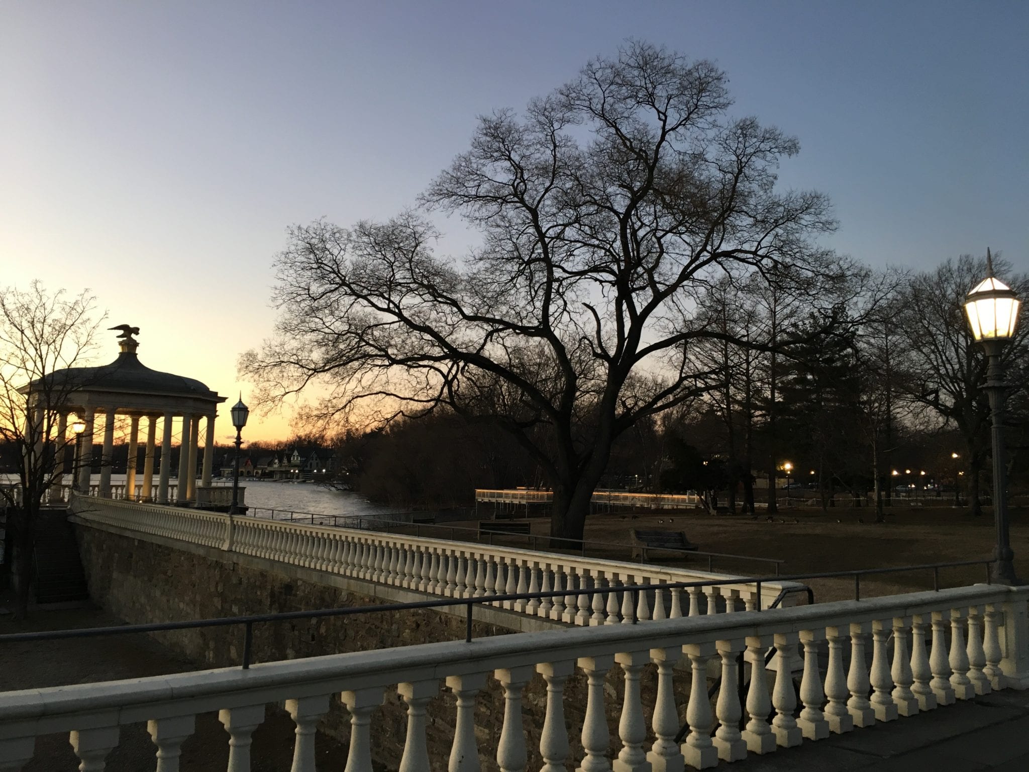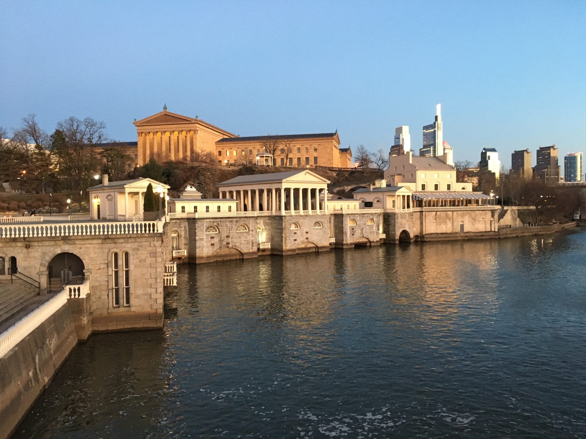 - Fairmount Water Works and an illuminated Boathouse Row