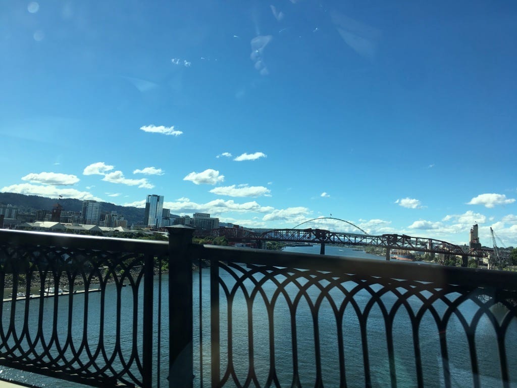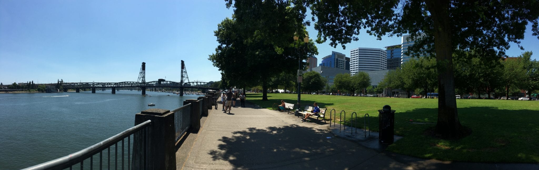 - Willamette River, Hawthorne Bridge, Waterfront Park with Salmon Street Springs, and a bit of downtown.