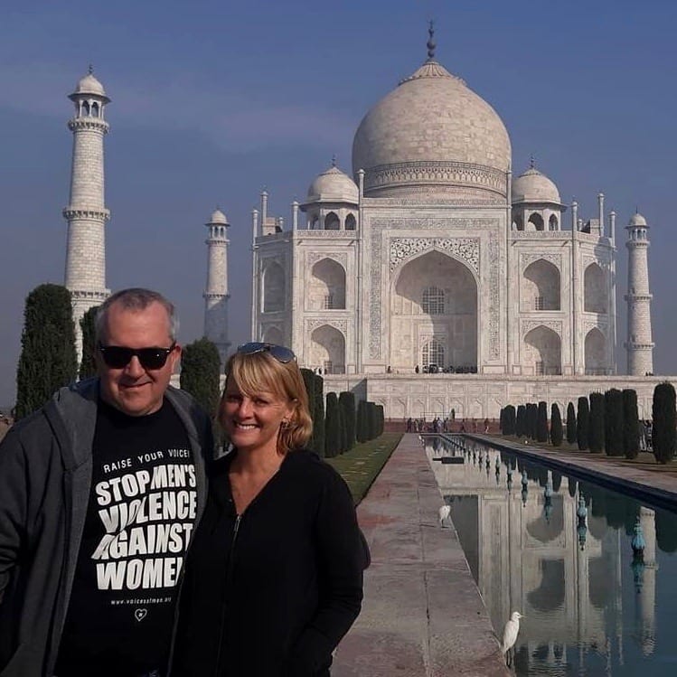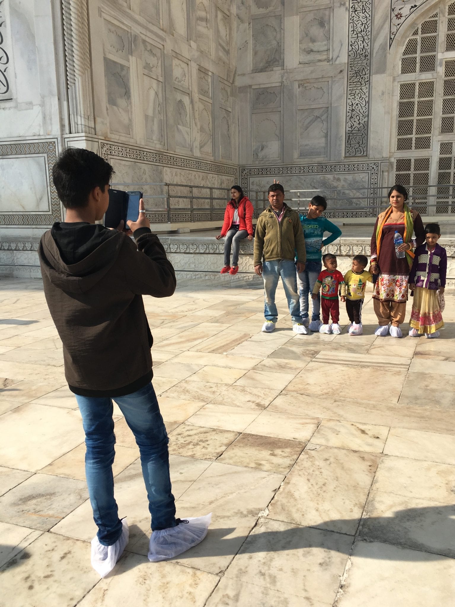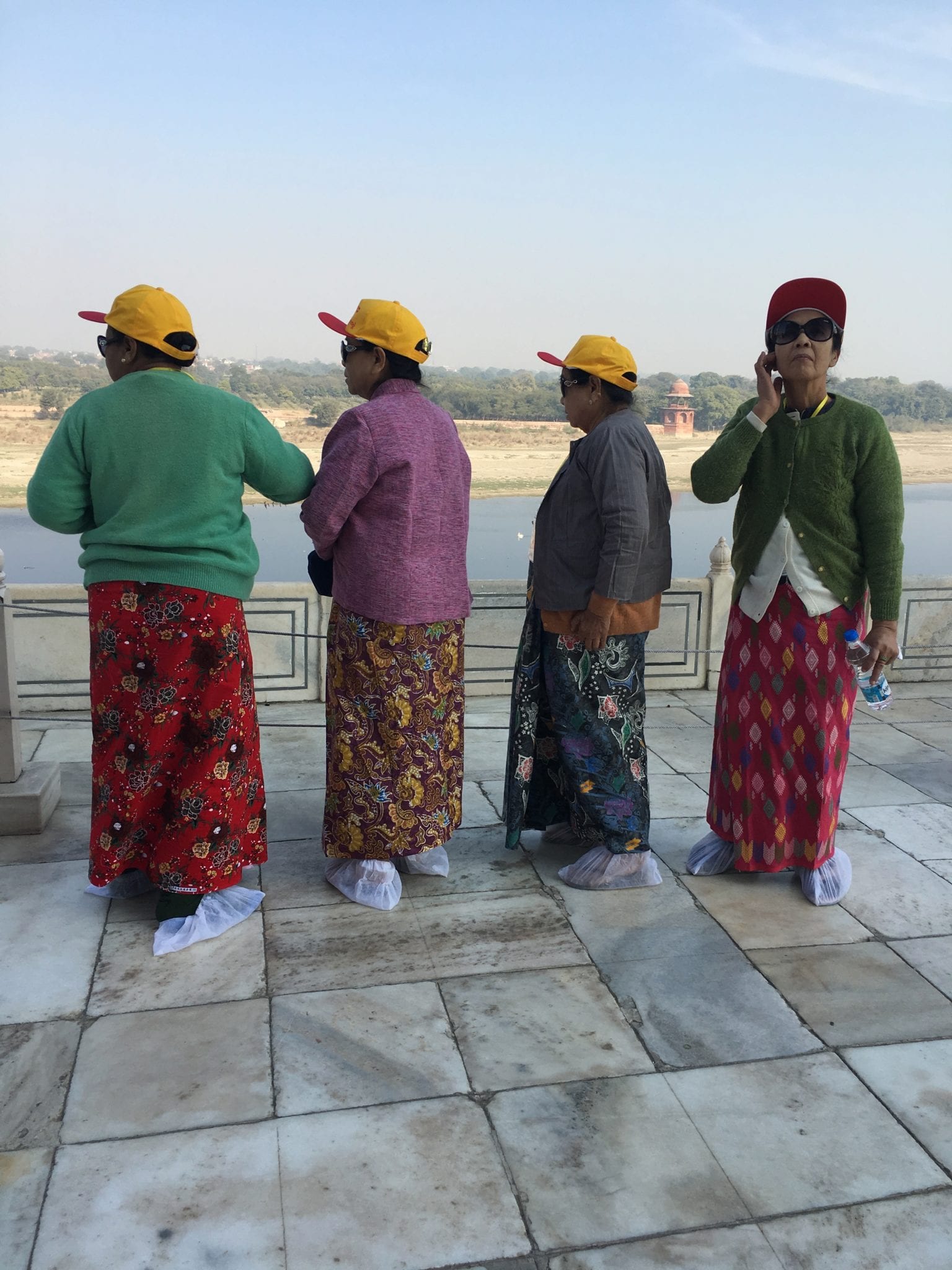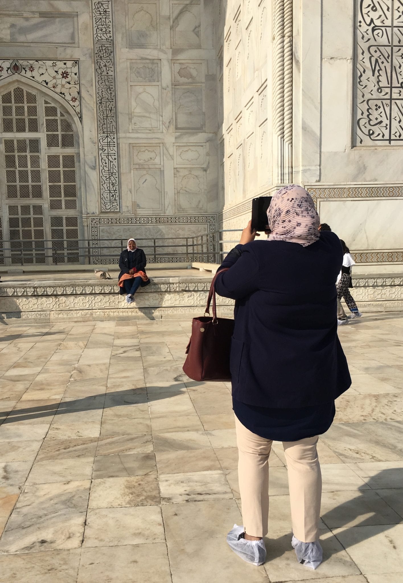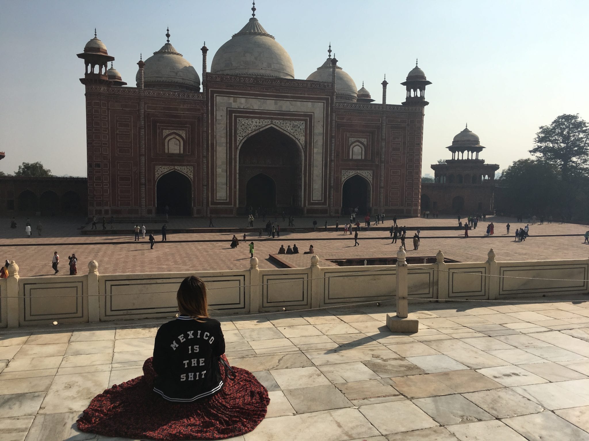 - This woman was a yoga teacher from Mexico, posing for social media, no doubt. She was delighted that I got a kick out of her jacket. Taj Mahal – Mehman Khanah in the background.