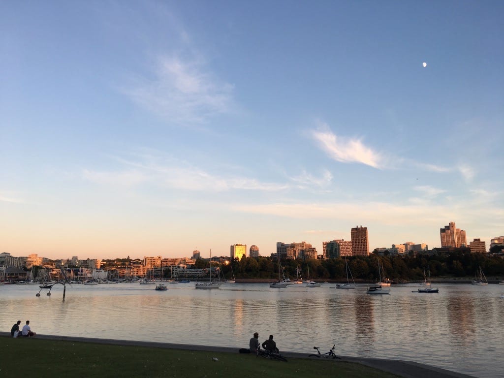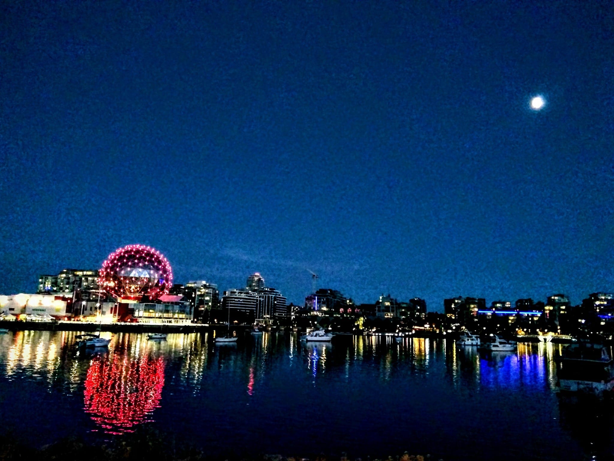 - Moon rise and sunset light over David Lam Park and False Creek