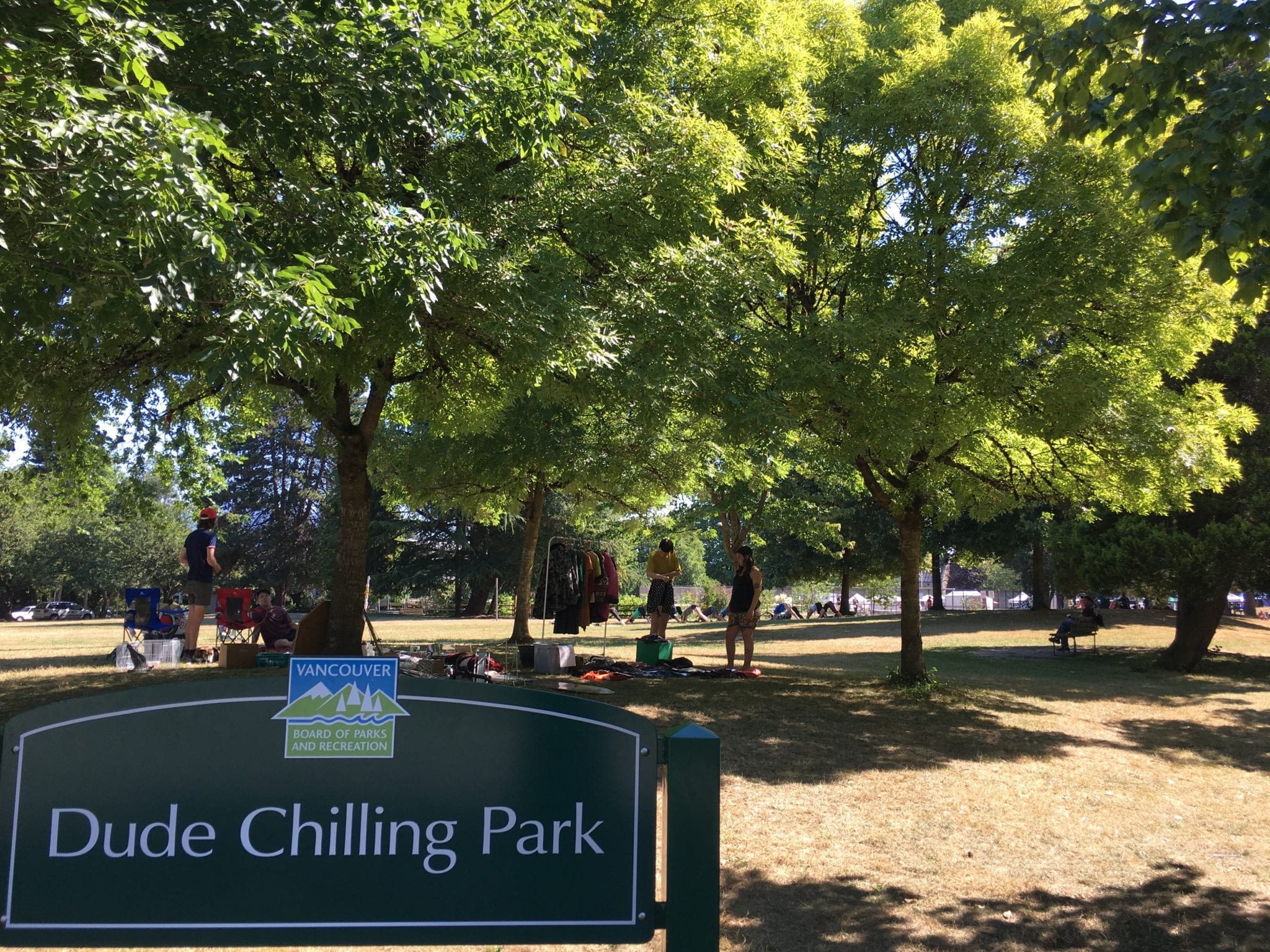 - From Wikipedia: “Dude Chilling Park is a sign installation, originally created as a prank, which now has official public art status in Vancouver, British Columbia, Canada. It is located in Guelph Park. In November 2012, the sign was created as a prank by local artist Viktor Briestensky, as a light-hearted reference to Reclining Figure, a public art piece by Michael Dennis installed in Guelph Park in 1991.” ?