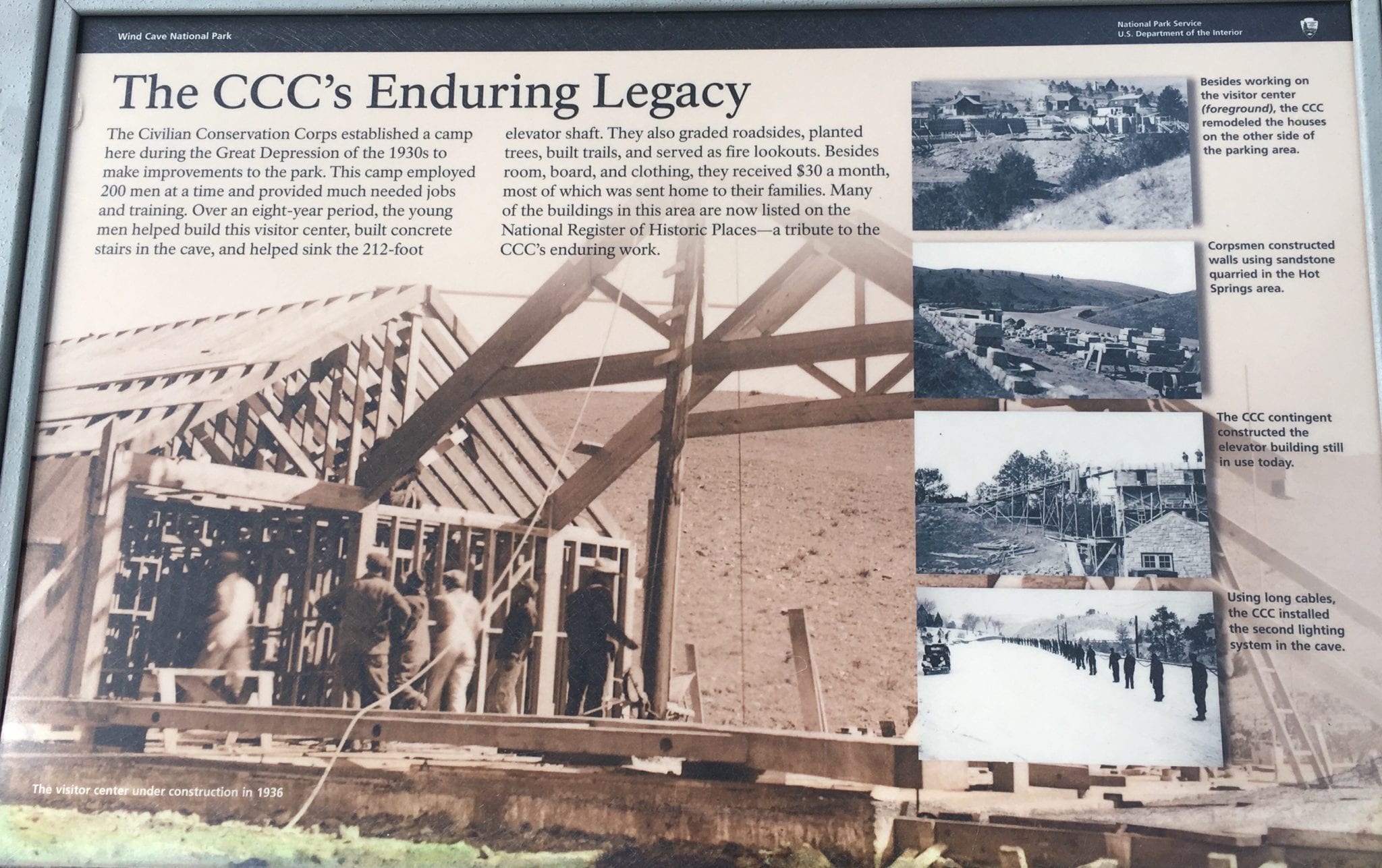 - An ode to the workers! This is a very big deal at Wind Cave. The Civilian Conservation Corps established the network of walkways, staircases, railings, lighting and elevator shaft that makes it accessible to and safe for the general public. My editorial comment is that I think the Civilian Conservation Corps was a brilliant idea that both provided jobs and created infrastructure in the U.S. I think that model should be seriously considered now since we clearly need both so badly!