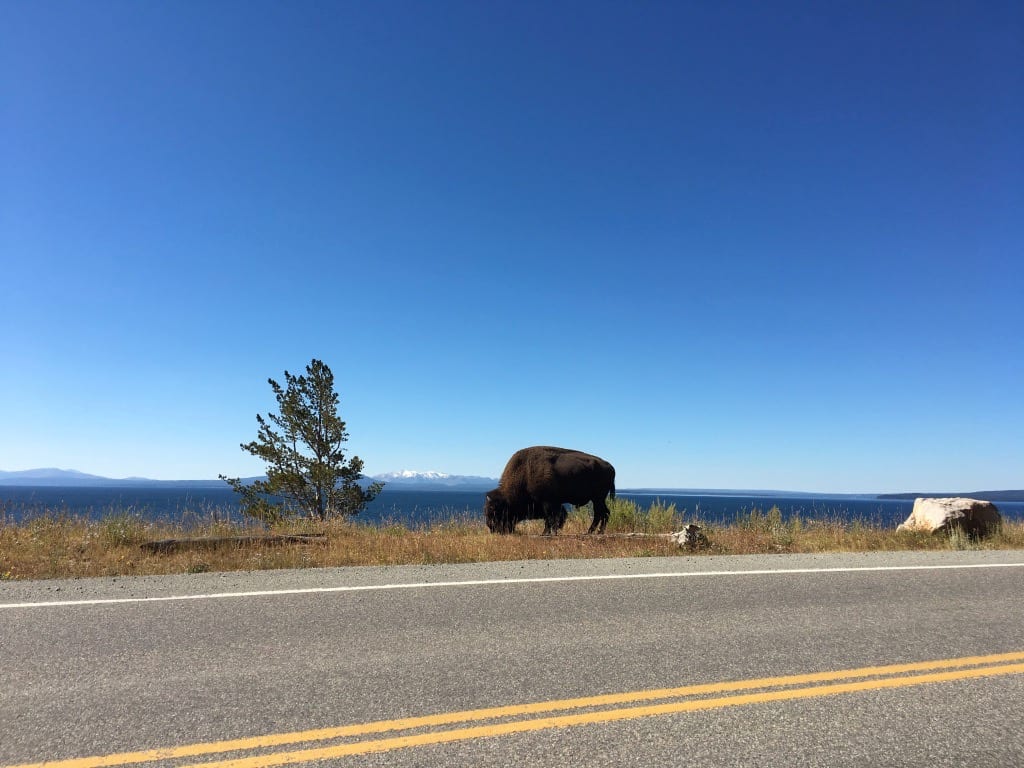 - This bison did me the enormous favor of posing by Yellowstone Lake in front of the snow-capped Absaroka Mountains. SCORE! I left the road part in the photo so you can see that I stayed safely in my car!